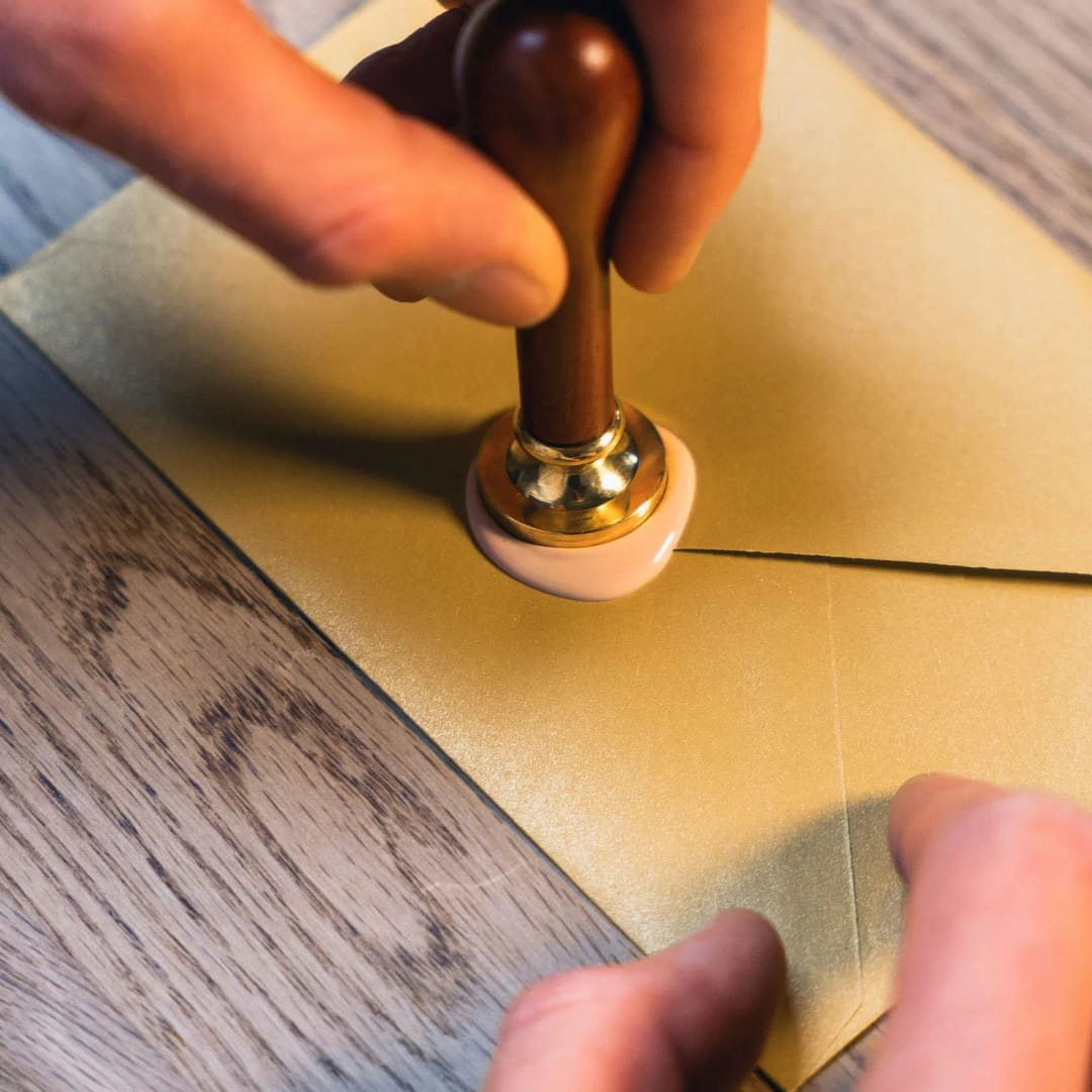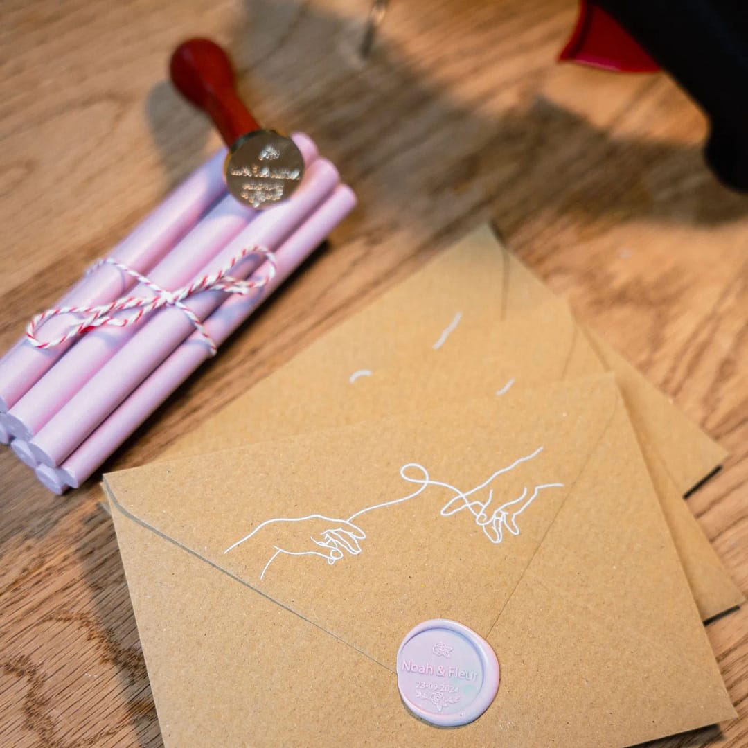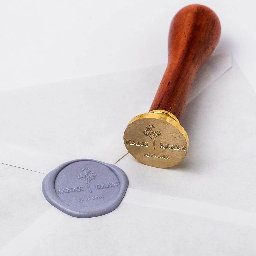 Met een speciale lakstempel met jullie namen en trouwdatum.